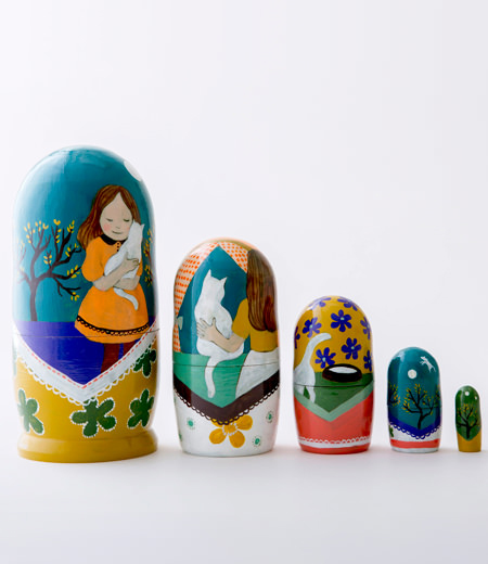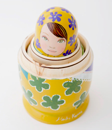 菅野麻衣子氏のマトリョーシカ人形シリーズです。手描きによる一点限定の作品で、細かい描き込みや絶妙な色彩設計は彼女の絵のクオリティそのまま。小作品約2~3枚分の描き込みボリュームです。一点ずつタイトルにちなんだストーリーが込められており、5体を順々に見ていくと素敵なファンタジーを読み解くことができるように構想されています。菅野氏の描画ならではの顔立ちの可愛らしさもポイント。表面は水性ニス処理がされており保存性が高く、いつまでもお部屋に置いて愛でていたい傑作です。
