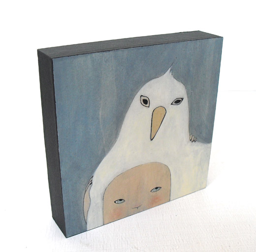 越後しの氏が一貫して追い続けているのは、その時々の自分の心象風景だといいます。念写のようにして日々、彼女の手元から生まれるユニークな「自画像」には、原画か版画かを問わず、詩的な含意の膨らみと民芸品的な可愛らしさがあります。本作は、大好評の置き作品シリーズ。小さいサイズの厚い板にアクリル絵具で丁寧に描き込まれています。
