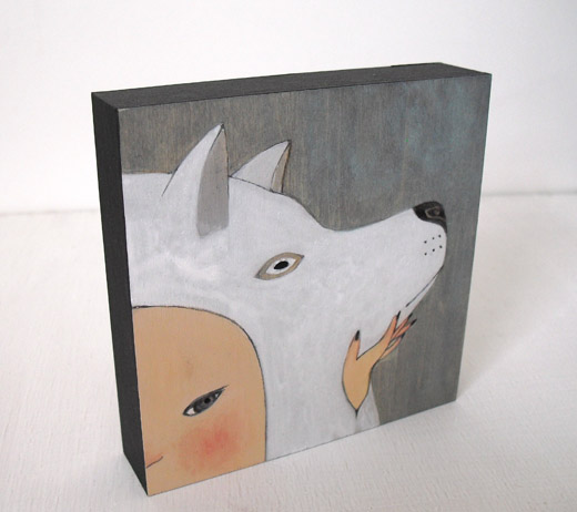 越後しの氏が一貫して追い続けているのは、その時々の自分の心象風景だといいます。念写のようにして日々、彼女の手元から生まれるユニークな「自画像」には、原画か版画かを問わず、詩的な含意の膨らみと民芸品的な可愛らしさがあります。本作は、大好評の置き作品シリーズ。モチーフの顔が半分だけのぞく、かわいらしい「でばんまち」シリーズの一作です。小さいサイズの厚い板にアクリル絵具で丁寧に描き込まれています。