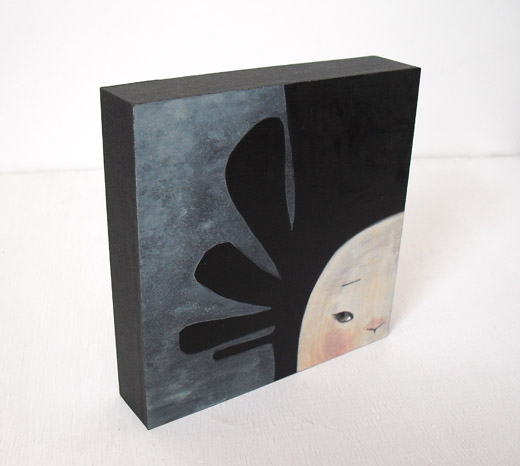 越後しの氏が一貫して追い続けているのは、その時々の自分の心象風景だといいます。念写のようにして日々、彼女の手元から生まれるユニークな「自画像」には、原画か版画かを問わず、詩的な含意の膨らみと民芸品的な可愛らしさがあります。本作は、大好評の置き作品シリーズ。モチーフの顔が半分だけのぞく、かわいらしい「でばんまち」シリーズの一作です。小さいサイズの厚い板にアクリル絵具で丁寧に描き込まれています。