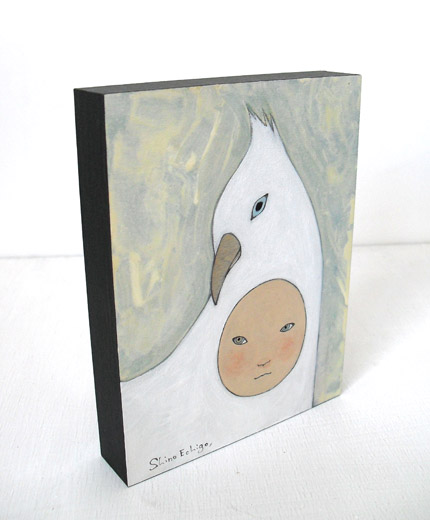 越後しの氏が一貫して追い続けているのは、その時々の自分の心象風景だといいます。念写のようにして日々、彼女の手元から生まれるユニークな「自画像」には、原画か版画かを問わず、詩的な含意の膨らみと民芸品的な可愛らしさがあります。本作は、大好評の置き作品シリーズ。モチーフの顔が半分だけのぞく、かわいらしい「でばんまち」シリーズの一作です。小さいサイズの厚い板にアクリル絵具で丁寧に描き込まれています。