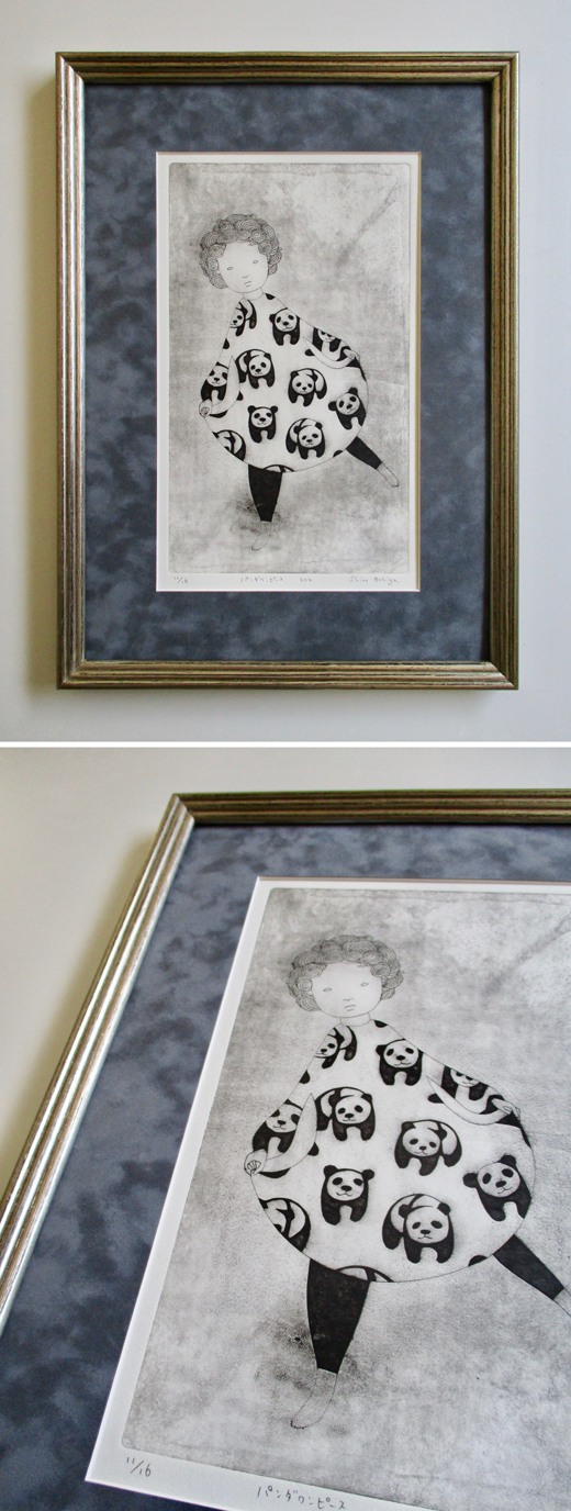 越後しの氏が一貫して追い続けているのは、その時々の自分の心象風景だといいます。念写のようにして日々、彼女の手元から生まれるユニークな「自画像」には、原画か版画かを問わず、詩的な含意の膨らみと民芸品的な可愛らしさがあります。本作は、彼女の紙版画作品の一作。拭き具合によりエディション1枚ずつの色合いや風合いが異なりますが、それが希少価値と魅力になっています。