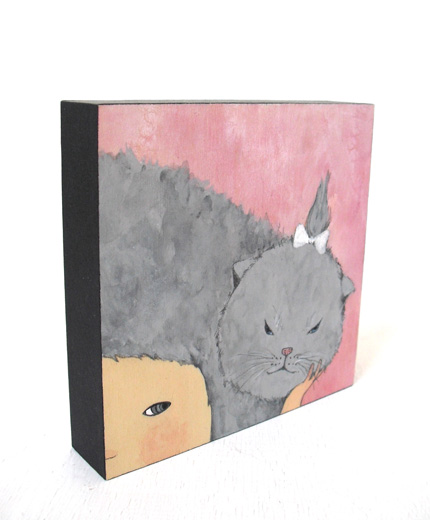 越後しの氏が一貫して追い続けているのは、その時々の自分の心象風景だといいます。念写のようにして日々、彼女の手元から生まれるユニークな「自画像」には、原画か版画かを問わず、詩的な含意の膨らみと民芸品的な可愛らしさがあります。本作は、大好評の置き作品シリーズ。モチーフの顔が半分だけのぞく、かわいらしい「でばんまち」シリーズの一作です。小さいサイズの厚い板にアクリル絵具で丁寧に描き込まれています。
