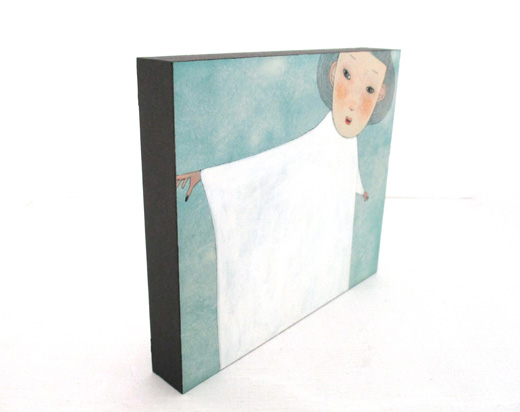 越後しの氏が一貫して追い続けているのは、その時々の自分の心象風景だといいます。念写のようにして日々、彼女の手元から生まれるユニークな「自画像」には、原画か版画かを問わず、詩的な含意の膨らみと民芸品的な可愛らしさがあります。本作は、人気の高い「置き作品シリーズ」からの一作。小さいサイズの厚い板にアクリル絵具で丁寧に描き込まれています。