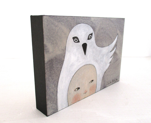越後しの氏が一貫して追い続けているのは、その時々の自分の心象風景だといいます。念写のようにして日々、彼女の手元から生まれるユニークな「自画像」には、原画か版画かを問わず、詩的な含意の膨らみと民芸品的な可愛らしさがあります。本作は、人気の高い「置き作品シリーズ」からの一作。小さいサイズの厚い板にアクリル絵具で丁寧に描き込まれています。