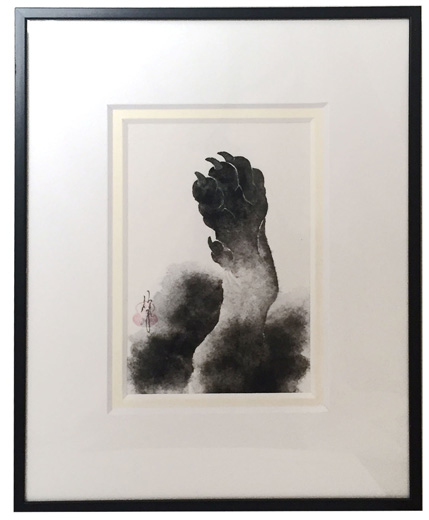 古代、信仰のため日本に呼ばれ、獅子から犬へと転じた狛犬に、愛玩犬の歴史や、それがぴったりと寄り添い続けてきた人の歴史との相関が見える、という曄田氏。本作はその、犬を描きながら実は人間の本質を照射することをコンセプトにしたという、人気「獅子狛」シリーズの一作です。2015年の個展「かげを結う」にて展示されました。トランスアジアな視野と、濃淡の味わい深い描きこみ、大胆な構図が魅力的です。