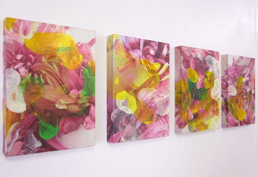 それは時に、筆のストロークに置き換えられ、余白の白が光になる。美しいととらえた対象から、さらに「あるもの」を引き出していく、ミクロな視点。絵具をのせて描いていくということで、映し出されている形態や重なり合う空間の美しさの中から、さらにより描きたいもの・自分の感覚と印象へ近づけるため再生と構築を繰り返し、自然(植物)の色や形(表情)を読み解いていく。