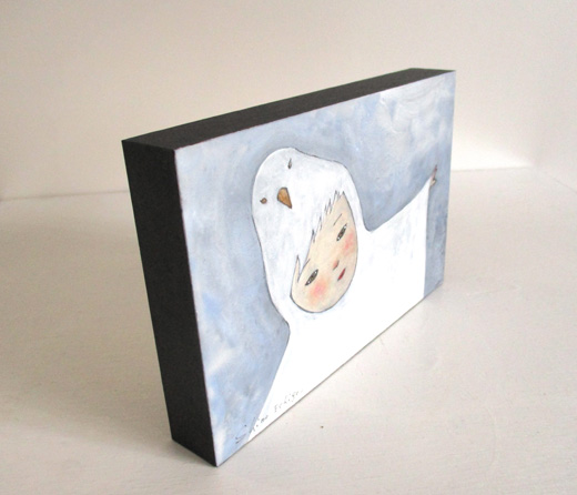 越後しの氏が一貫して追い続けているのは、その時々の自分の心象風景だといいます。念写のようにして日々、彼女の手元から生まれるユニークな「自画像」には、原画か版画かを問わず、詩的な含意の膨らみと民芸品的な可愛らしさがあります。本作は、人気の高い「置き作品シリーズ」からの一作。小さいサイズの厚い板にアクリル絵具で丁寧に描き込まれています。