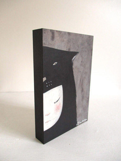 越後しの氏が一貫して追い続けているのは、その時々の自分の心象風景だといいます。念写のようにして日々、彼女の手元から生まれるユニークな「自画像」には、原画か版画かを問わず、詩的な含意の膨らみと民芸品的な可愛らしさがあります。本作は、人気の高い「置き作品シリーズ」からの一作。小さいサイズの厚い板にアクリル絵具で丁寧に描き込まれています。