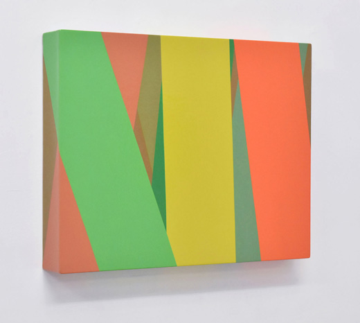 工業製品の構造をなぞるシリーズの発展で、支持体の箱自体がモチーフになっています。 本作は箱の上にテープがかかっているという設定で構成されています。 すべてフラットな色面にも関わらず、紙テープ同士に奥行きがある(どれが前に出て、どれが後ろに下がるか)のがおもしろい作品です。隙間と両サイドに見え隠れするくレッドブラウンの部分が、テープの下にある箱、という設定です。 パネル型BOXタイプなので厚みがあります。