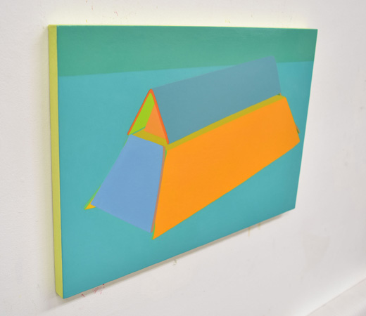 厚紙や身近なものを使って文化的建築物・構築物を見立てたシリーズの1点。 本作は、入母屋造の屋根を厚紙で作ったものがモチーフになっています。 微妙な線のゆがみや、紙の厚み、角の丸みなどに、実物の建築物とは違うおもしろさが見え隠れします。 パネルタイプですが、側面に彩色があり、壁に色がささやかに反射するようになっています。