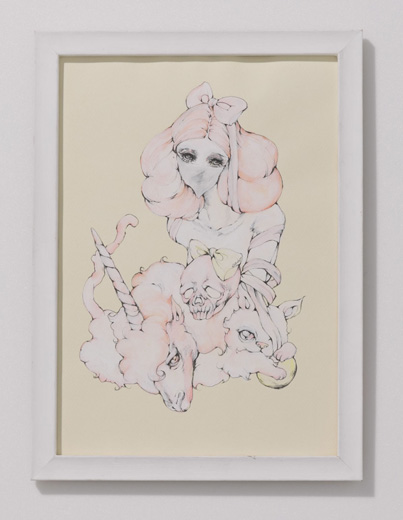 ERICO氏が一貫して描き続けているのは、耽美的な面立ちの女性を中心とする、メランコリックな「乙女画」。水彩色鉛筆とインクペン、アクリル絵具をミックスして描くその世界には、乙女と対極的なバッドイメージも調合され、甘辛ミックスのファンタジーに仕上げられているのが特徴です。グラフィティ系のフットワークと、女性らしい優美な描線との絶妙なハイブリッドがユニーク。やや懐古的なロマンティシズムの香りもアパレルブランドとの相性がよく、各所でのアートフェアや展覧会、インストアイベントなどで熱心なコレクターを増やし続けています。
