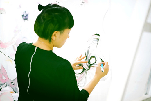 ERICO氏が一貫して描き続けているのは、耽美的な面立ちの女性を中心とする、メランコリックな「乙女画」。水彩色鉛筆とインクペン、アクリル絵具をミックスして描くその世界には、乙女と対極的なバッドイメージも調合され、甘辛ミックスのファンタジーに仕上げられているのが特徴です。グラフィティ系のフットワークと、女性らしい優美な描線との絶妙なハイブリッドがユニーク。やや懐古的なロマンティシズムの香りもアパレルブランドとの相性がよく、各所でのアートフェアや展覧会、インストアイベントなどで熱心なコレクターを増やし続けています。