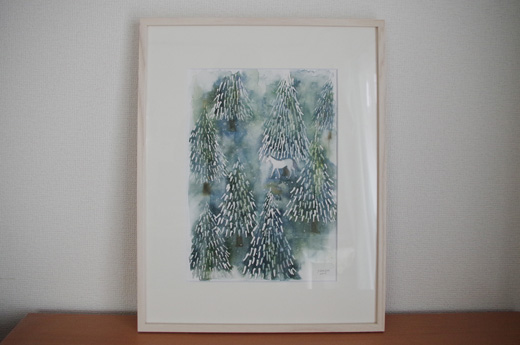 おもに森の生き物を題材にファンタジックな水彩画を発表し続けている村田なつか氏。童話本や絵本のワンシーンを思わせる場面構想力は、透明水彩の独特な滲みとマスキング技法とを駆使することで、より洗練された境地に達しています。動物イラストレーションの王道を承けつつ、自然の陰りや発光感まで豊かに表現できる余白の巧みな使い方が印象的。可愛らしいだけではなく、鉱石や食べ物と動物との組み合わせも試みるなど、グラフィカルでシュールな着想の面白さにも特徴があります。本作は、朝の霧が立ち込める森がモチーフ。個展「けもの」(2016年、代官山・GALLERY SPEAK FOR)で展示されました。
