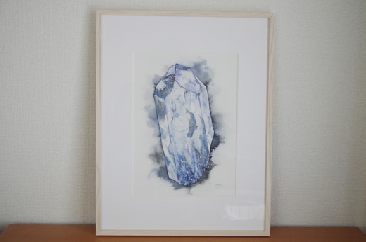 おもに森の生き物を題材にファンタジックな水彩画を発表し続けている村田なつか氏。童話本や絵本のワンシーンを思わせる場面構想力は、透明水彩の独特な滲みとマスキング技法とを駆使することで、より洗練された境地に達しています。動物イラストレーションの王道を承けつつ、自然の陰りや発光感まで豊かに表現できる余白の巧みな使い方が印象的。可愛らしいだけではなく、鉱石や食べ物と動物との組み合わせも試みるなど、グラフィカルでシュールな着想の面白さにも特徴があります。本作は、鉱石と動物のイラストレーションシリーズからの一枚。個展「鉱石に住む」(2016年、新宿・マルイアネックスFEWMANY)で展示されました。
