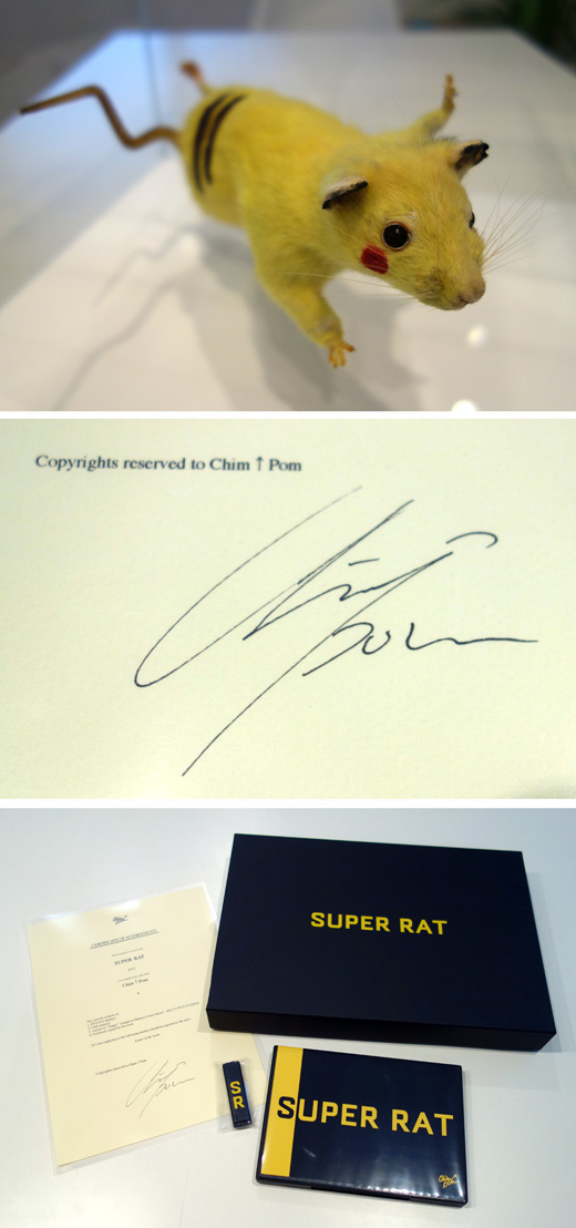 「スーパーラット」とは、殺鼠剤などの毒への 耐性を遺伝化させながら、都市圏で爆発的に 増えているネズミの通称であり、ネズミ駆除業者による造語である。Chim↑Pomは、2006年、2008年、2011年にスーパーラットを網で捕獲し、その剥製をアニメ「ポケットモンスター」のキャラクター「ピカチュウ」に模して黄色く着色し、捕獲映像とともに展示した。