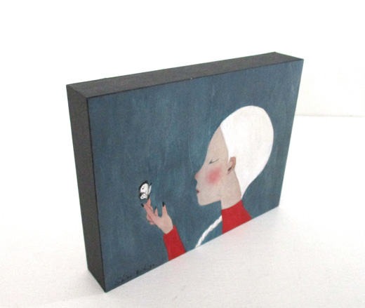 越後しの氏が一貫して追い続けているのは、その時々の自分の心象風景だといいます。念写のようにして日々、彼女の手元から生まれるユニークな「自画像」には、原画か版画かを問わず、詩的な含意の膨らみと民芸品的な可愛らしさがあります。本作は、2017年の個展「思わせぶりな沈黙」展(東京・AL)の展示作品です。人気の高い「オキエ(置き絵)シリーズ」からの一作で、小さいサイズの厚い板にアクリル絵具で丁寧に描き込まれています。