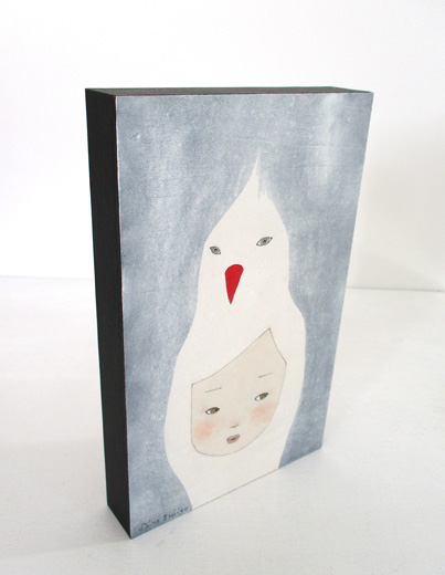 越後しの氏が一貫して追い続けているのは、その時々の自分の心象風景だといいます。念写のようにして日々、彼女の手元から生まれるユニークな「自画像」には、原画か版画かを問わず、詩的な含意の膨らみと民芸品的な可愛らしさがあります。本作は、2017年の個展「思わせぶりな沈黙」展(東京・AL)の展示作品です。人気の高い「オキエ(置き絵)シリーズ」からの一作で、小さいサイズの厚い板にアクリル絵具で丁寧に描き込まれています。
