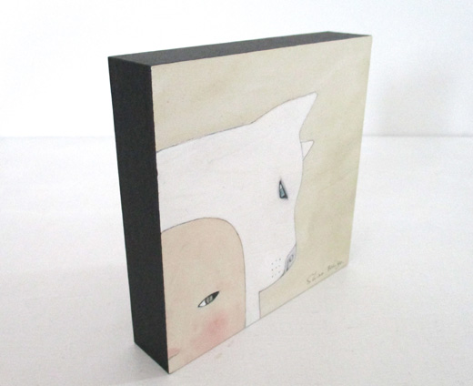 越後しの氏が一貫して追い続けているのは、その時々の自分の心象風景だといいます。念写のようにして日々、彼女の手元から生まれるユニークな「自画像」には、原画か版画かを問わず、詩的な含意の膨らみと民芸品的な可愛らしさがあります。本作は、2017年の個展「思わせぶりな沈黙」展(東京・AL)の展示作品です。人気の高い「オキエ(置き絵)シリーズ」からの一作で、小さいサイズの厚い板にアクリル絵具で丁寧に描き込まれています。