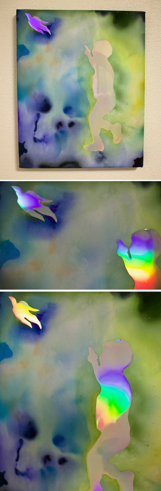 新しい季節になると自然と気持ちが前向きになって、 外に目が向くようになることがよくありました。 そんな子供のように無邪気に好奇心を抱く気持ちを描きました。 作家独自の技法により、人物と鳥の部分は見る角度によって、色彩が七色に変化します。