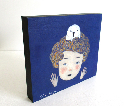 越後しの氏が一貫して追い続けているのは、その時々の自分の心象風景だといいます。念写のようにして日々、彼女の手元から生まれるユニークな「自画像」には、原画か版画かを問わず、詩的な含意の膨らみと民芸品的な可愛らしさがあります。本作は、2017年の個展「野いちご」(福島・珈琲楓舎)の展示作品です。人気の高い「OKIE(置き絵)シリーズ」からの一作で、小さいサイズの厚い板にアクリル絵具で丁寧に描き込まれています。
