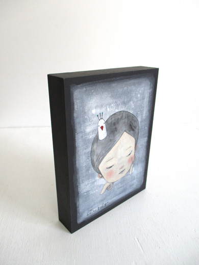 越後しの氏が一貫して追い続けているのは、その時々の自分の心象風景だといいます。念写のようにして日々、彼女の手元から生まれるユニークな「自画像」には、原画か版画かを問わず、詩的な含意の膨らみと民芸品的な可愛らしさがあります。本作は、2017年の個展「野いちご」(福島・珈琲楓舎)の展示作品です。人気の高い「OKIE(置き絵)シリーズ」からの一作で、小さいサイズの厚い板にアクリル絵具で丁寧に描き込まれています。