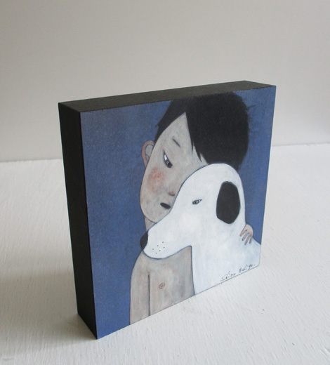 越後しの氏が一貫して追い続けているのは、その時々の自分の心象風景だといいます。念写のようにして日々、彼女の手元から生まれるユニークな「自画像」には、原画か版画かを問わず、詩的な含意の膨らみと民芸品的な可愛らしさがあります。本作は、2017年の個展「ついさっきまで夏だった」(仙台・晩翠画廊)の展示作品です。人気の高い「OKIE(置き絵)シリーズ」からの一作で、小さいサイズの厚い板にアクリル絵具で丁寧に描き込まれています。