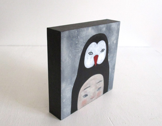 越後しの氏が一貫して追い続けているのは、その時々の自分の心象風景だといいます。念写のようにして日々、彼女の手元から生まれるユニークな「自画像」には、原画か版画かを問わず、詩的な含意の膨らみと民芸品的な可愛らしさがあります。本作は、2017年の個展「ついさっきまで夏だった」(仙台・晩翠画廊)の展示作品です。人気の高い「OKIE(置き絵)シリーズ」からの一作で、小さいサイズの厚い板にアクリル絵具で丁寧に描き込まれています。