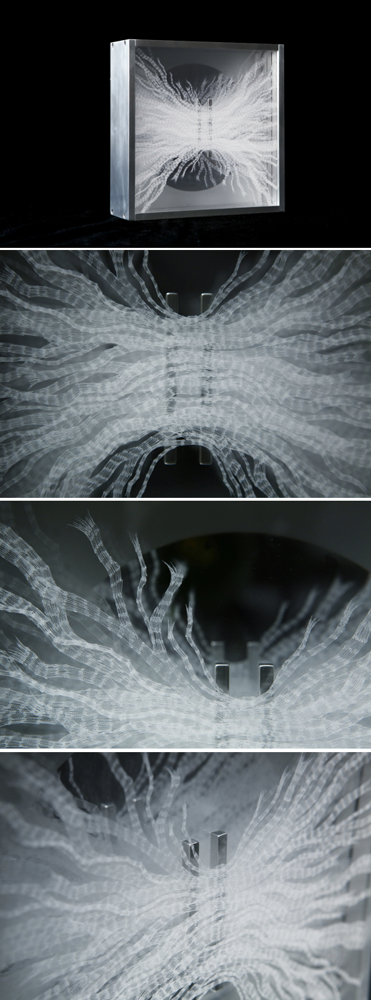 アクリル板を削って描画したものを重ねています。/素材:アクリル板、アクリルミラー板、アルミ枠、塗料、アルミ、真鍮