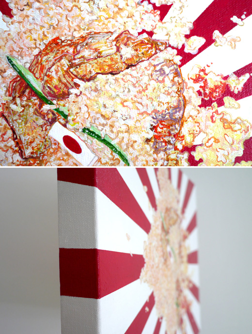 本シリーズは、日本とシンガポールの過去と現在を照らし合わせ、問い直す試みである。シンガポールの日常のありふれた食事を切り取り、日本のお子様ランチに見られる日の丸の爪楊枝を刺す。それは他愛ない飾りとも言えるが、背景に旭日旗を用いることで現実的な意味合いを帯びる。国旗を突き立てるということはしばしば征服の意味を持ち、旧日本軍の軍旗であった旭日旗については言わずもがなである。