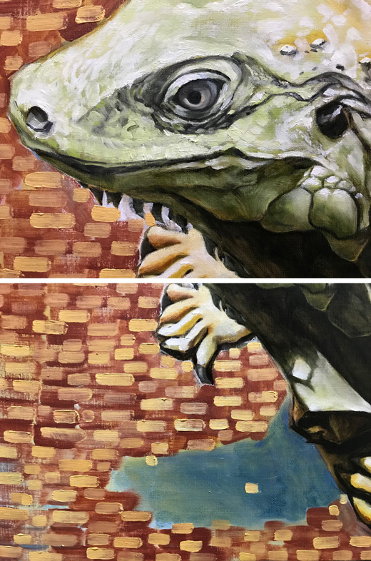 制作プロセス 私は制作をする上で「モチーフをどう描けるか。」という点を大切に考えている。 私の絵の多くは絵具の厚塗りであり、筆致の厚みも選んで描いている。絵を描く作業の過程では、一度観えた線を描き直した痕跡などを残して描かれる。何故なら、あえてフラットな写真の表面を観ながら制作するにあたって私の実感にある意識を通した身体の動きを絵具の表情として鑑賞者に与えるための絵の「生々しさ」であると私は考えているからである。