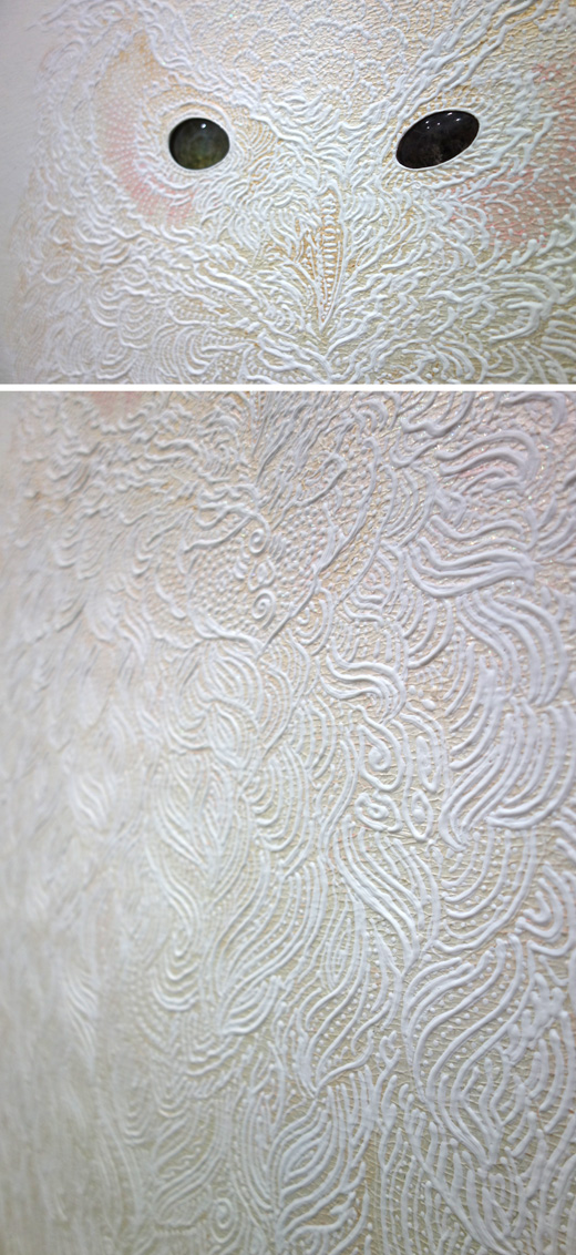 acrylic, pearl powder, glass eye by Hidamari glass & garden quartz eye on wood panel