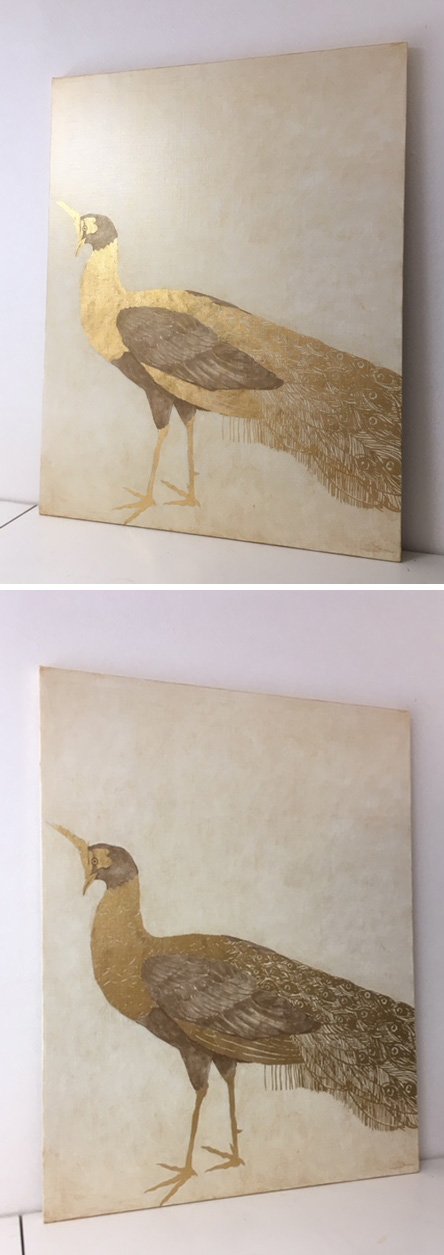 パネルにキャンバスを張り、金色の箔と油彩で孔雀の絵をかきました。丸山応挙の孔雀図からインスピレーションを受けました。
