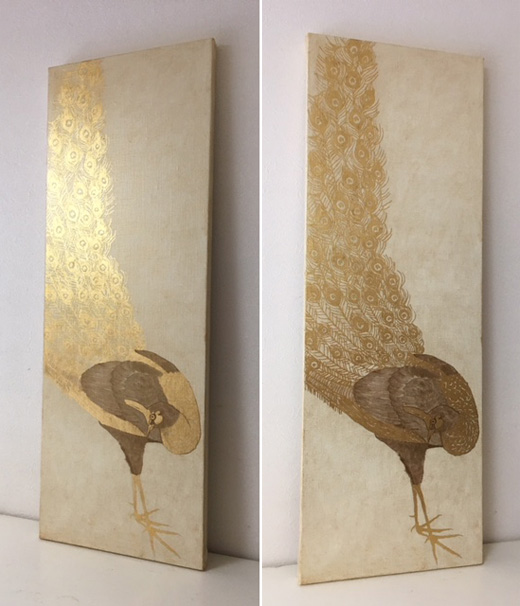 パネルにキャンバスを張り、金色の箔と油彩で孔雀の絵をかきました。丸山応挙の孔雀図からインスピレーションを得ました。