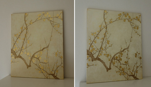 キャンバスに金色の箔と油彩で、梅の枝の絵を描きました。琳派の作品からインスピレーションを得ました。