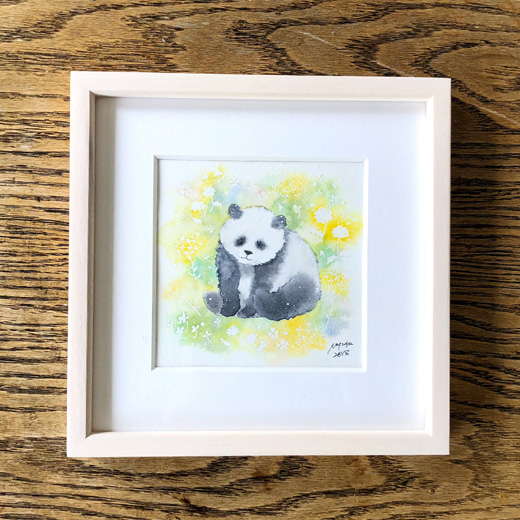 おもに森の生き物を題材にファンタジックな水彩画を発表し続けている村田なつか氏。童話本や絵本のワンシーンを思わせる場面構想力は、透明水彩の独特な滲みとマスキング技法とを駆使することで、より洗練された境地に達しています。動物イラストレーションの王道を承けつつ、自然の陰りや発光感まで豊かに表現できる余白の巧みな使い方が印象的。可愛らしいだけではなく、鉱石や食べ物と動物との組み合わせも試みるなど、グラフィカルでシュールな着想の面白さにも特徴があります。本作は、パンダを題材に描き下ろした最新3連作のなかの1作です。