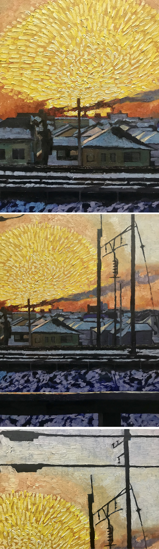制作プロセス 私は制作をする上で「モチーフをどう描けるか。」という点を大切に考えている。 私の絵の多くは絵具の厚塗りであり、筆致の厚みも選んで描いている。絵を描く作業の過程では、一度観えた線を描き直した痕跡などを残して描かれる。何故なら、あえてフラットな写真の表面を観ながら制作するにあたって私の実感にある意識を通した身体の動きを絵具の表情として鑑賞者に与えるための絵の「生々しさ」であると私は考えているからである。