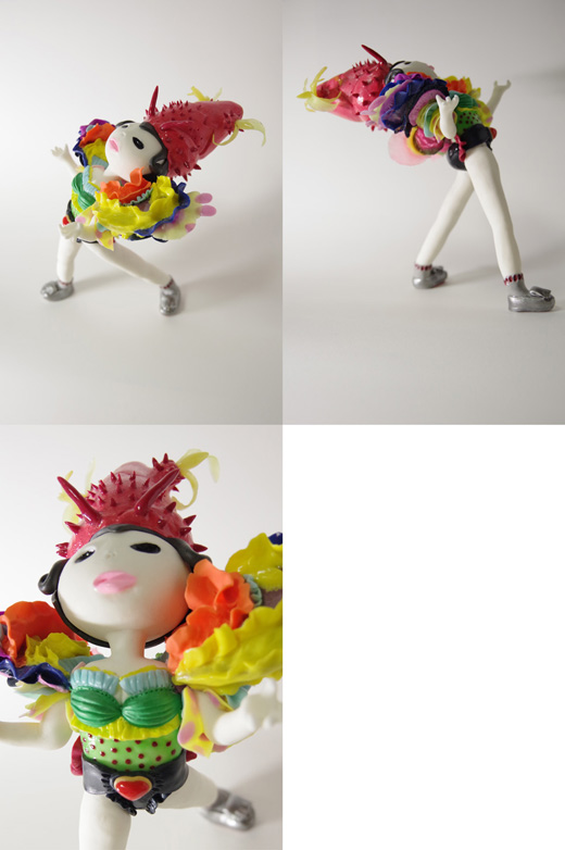 樹脂粘土にアクリル絵具を混ぜ込み成型/その他使用材料はニス、軽量粘土、心材で針金を使用