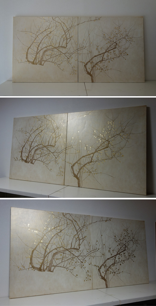 キャンバスに金色の箔と油彩を使って、白梅図を描きました。二枚一組です。