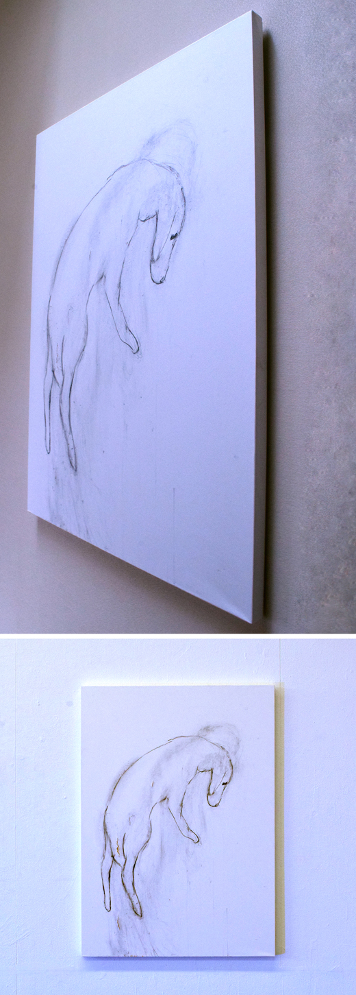 描かれた線を消す際、摩擦により傷む紙の表情を残しています。絵の具は使わず鉛筆と木炭のみで描きます。 線を引くときにずっと奥まった場所へ手が届いているような距離感が生まれることを、作品の存在理由としても考えています。