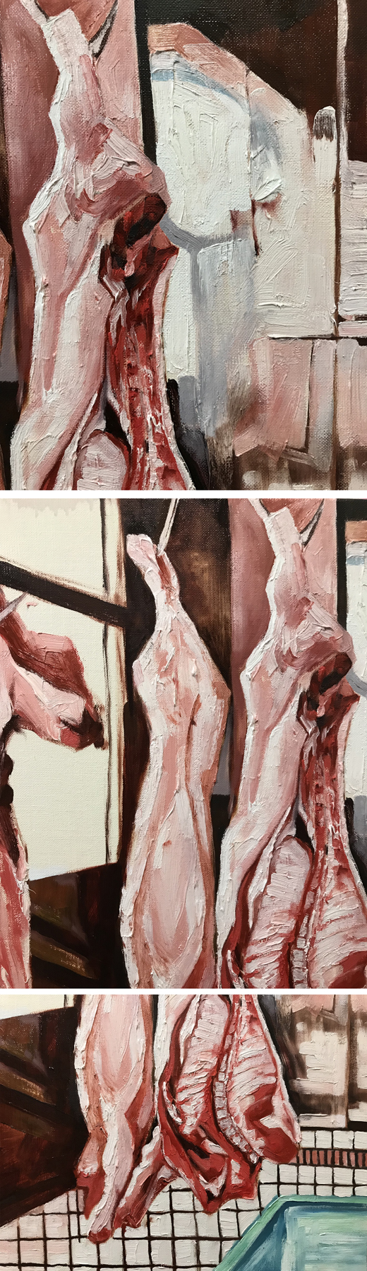 制作プロセス 私は制作をする上で「モチーフをどう描けるか。」という点を大切に考えている。 私の絵の多くは、油絵の具の厚塗りである。筆致の方向性や絵具の厚み、特に色はよく捏ねて、一つ一つ確認した上で要素を選んで描いている。