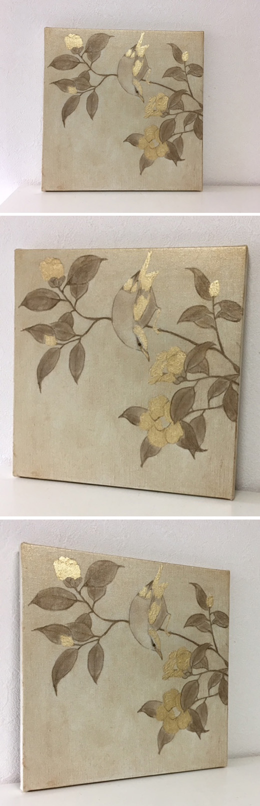 キャンバスに金色の箔と油彩を使って椿と鳥の絵を描きました。