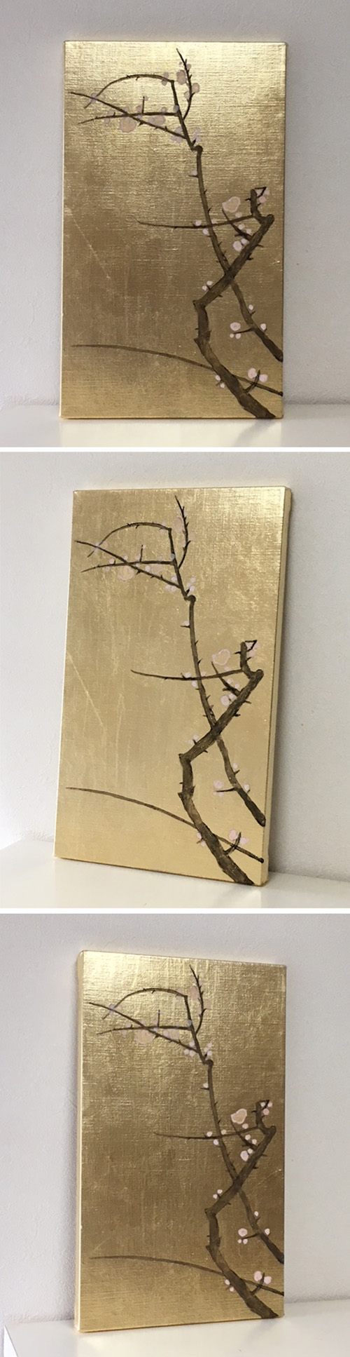 キャンバスに金色の箔を全面に貼り、アクリルで梅の枝を描きました。