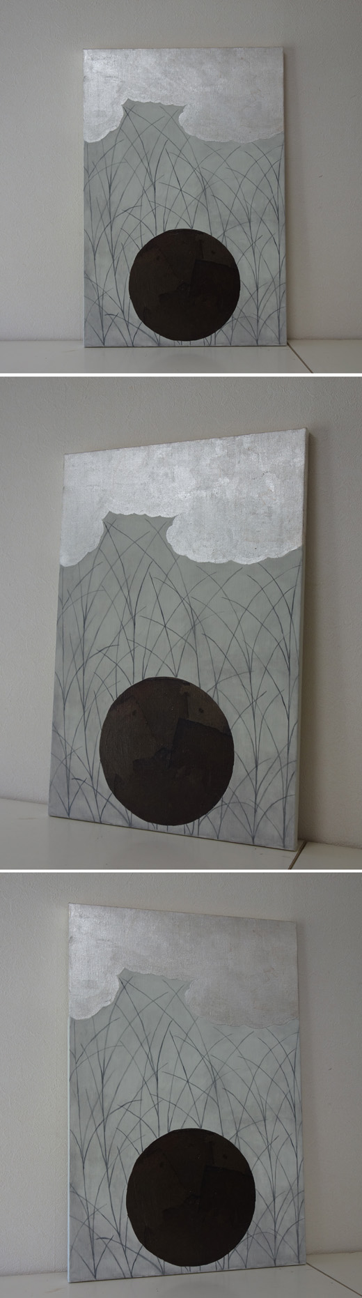 キャンバスに雲の部分が銀箔、月の部分が黒箔、残りはアクリル画で武蔵野図を描いてみました。