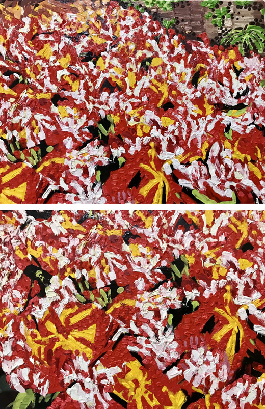 私の絵の多くは、油絵の具の厚塗りである。筆致の方向性や絵具の厚み、特に色はよく捏ねて、一つ一つ確認した上で要素を選んで描いている。