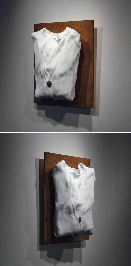 服に水で溶いた石膏を塗る。何度も塗り重ねる。これを繰り返すことで繊維が固まり着用は不可能になり、そのまま服の姿をした白い彫刻と化す。 布は人の思いや記憶を宿しやすい物質であり、服はその最たる例だ。繊維と繊維の隙間にはある懐かしさを想起させる匂いや温度が潜んでいる。石膏で繊維に蓋をするのは、そこに宿った記憶が散らばらないように閉じ込める作業。ただし、いつでも石膏の膜を剥がして取り出すことが出来る。
