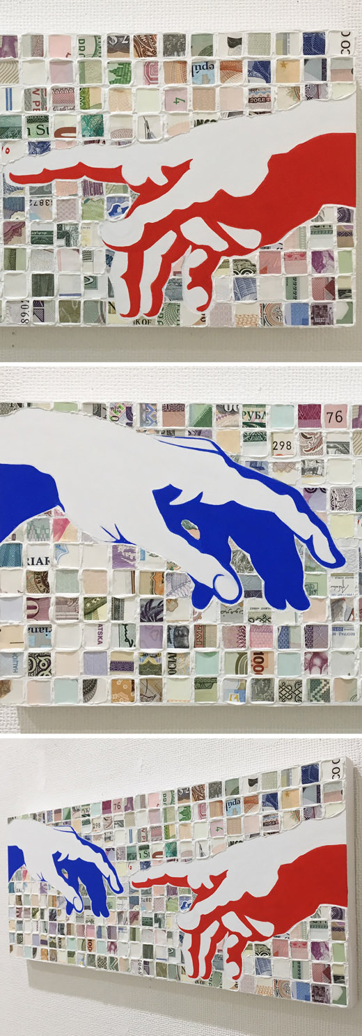 100ヵ国紙幣・オートマティックペインティング・アクリル・モデリングペースト・木製パネル