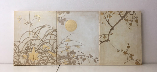 キャンバスに金色の箔と油彩で月と秋草を描きました。