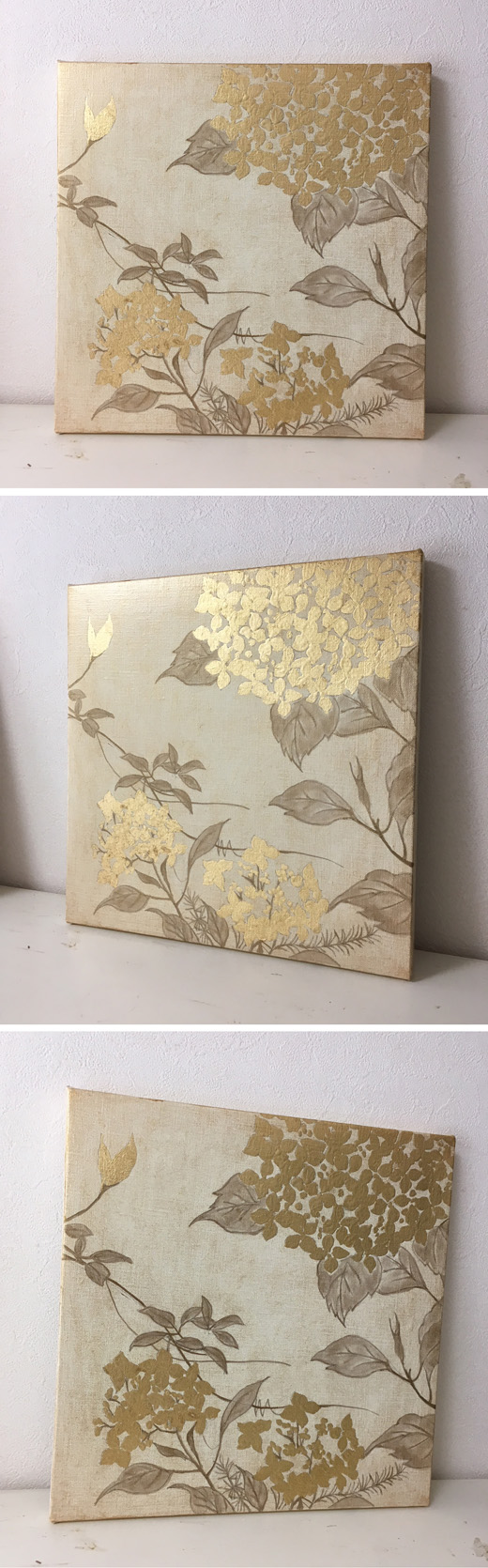 キャンバスに金色の箔と油彩で紫陽花の絵を描きました。