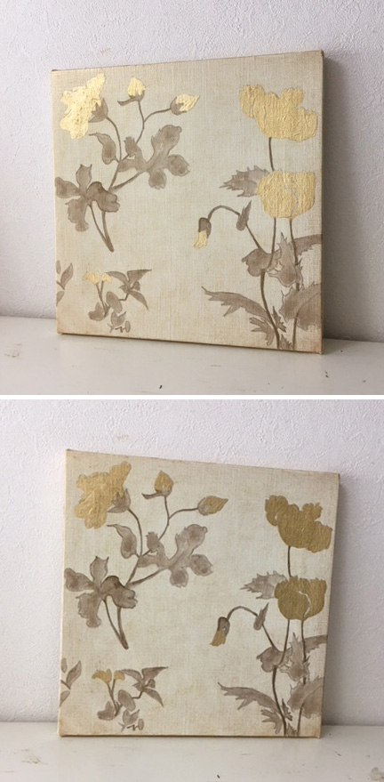 キャンバスに金色の箔と油彩で四季花草図の一部を描いて見ました。
